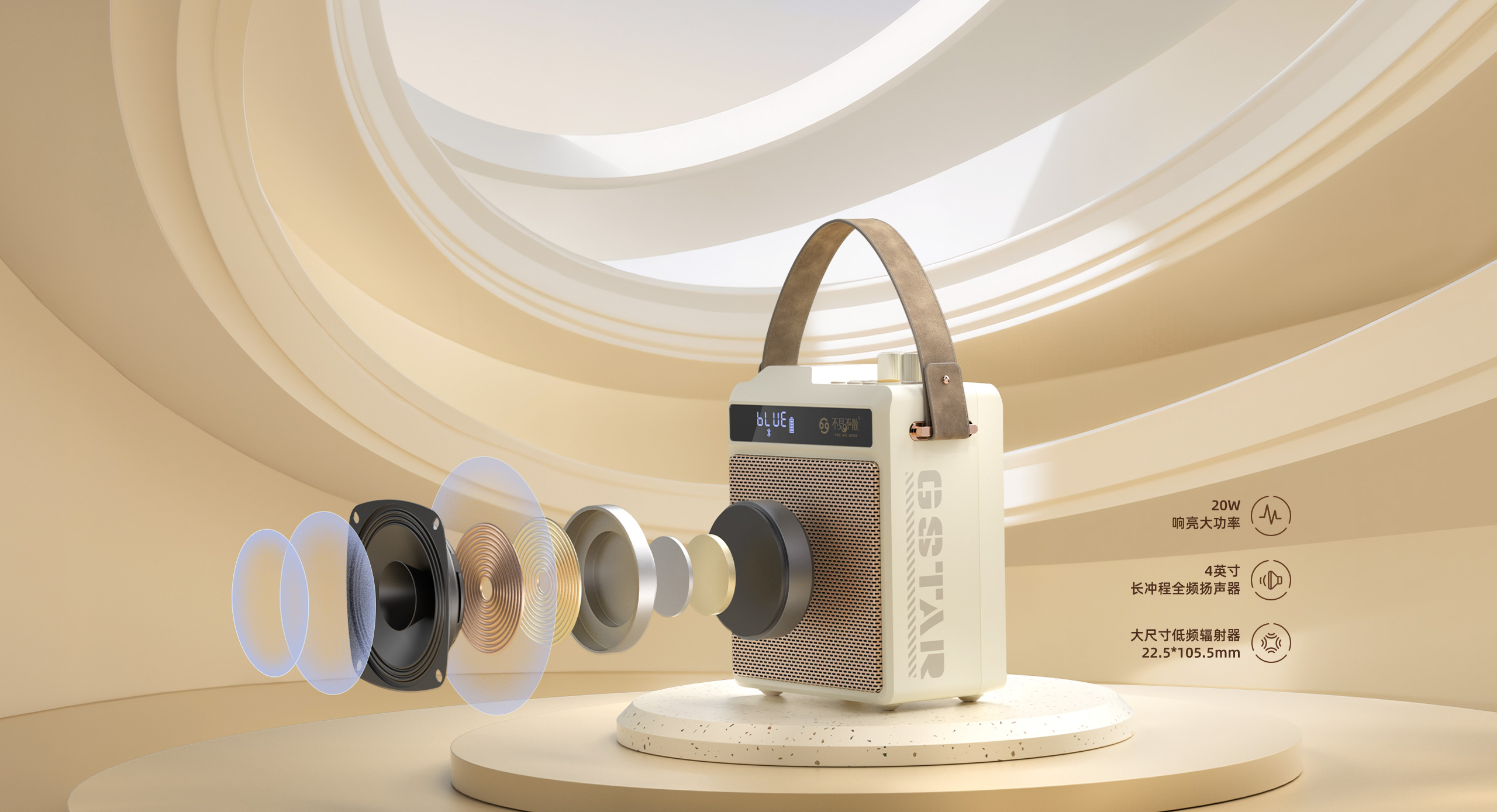 搭載4英寸長沖程全頻揚(yáng)聲器, 20W響亮大功率,專為唱歌設(shè)計的回聲優(yōu)化,聲音更加立體。