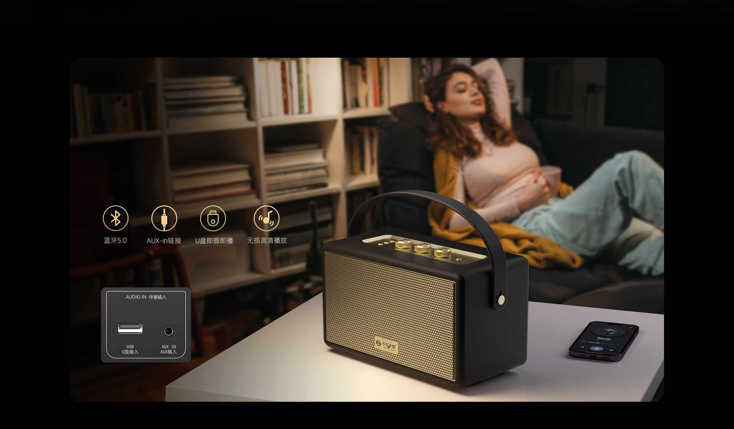 支持藍牙、U盤、AUX-in輸入3種播放模式,操作簡便。