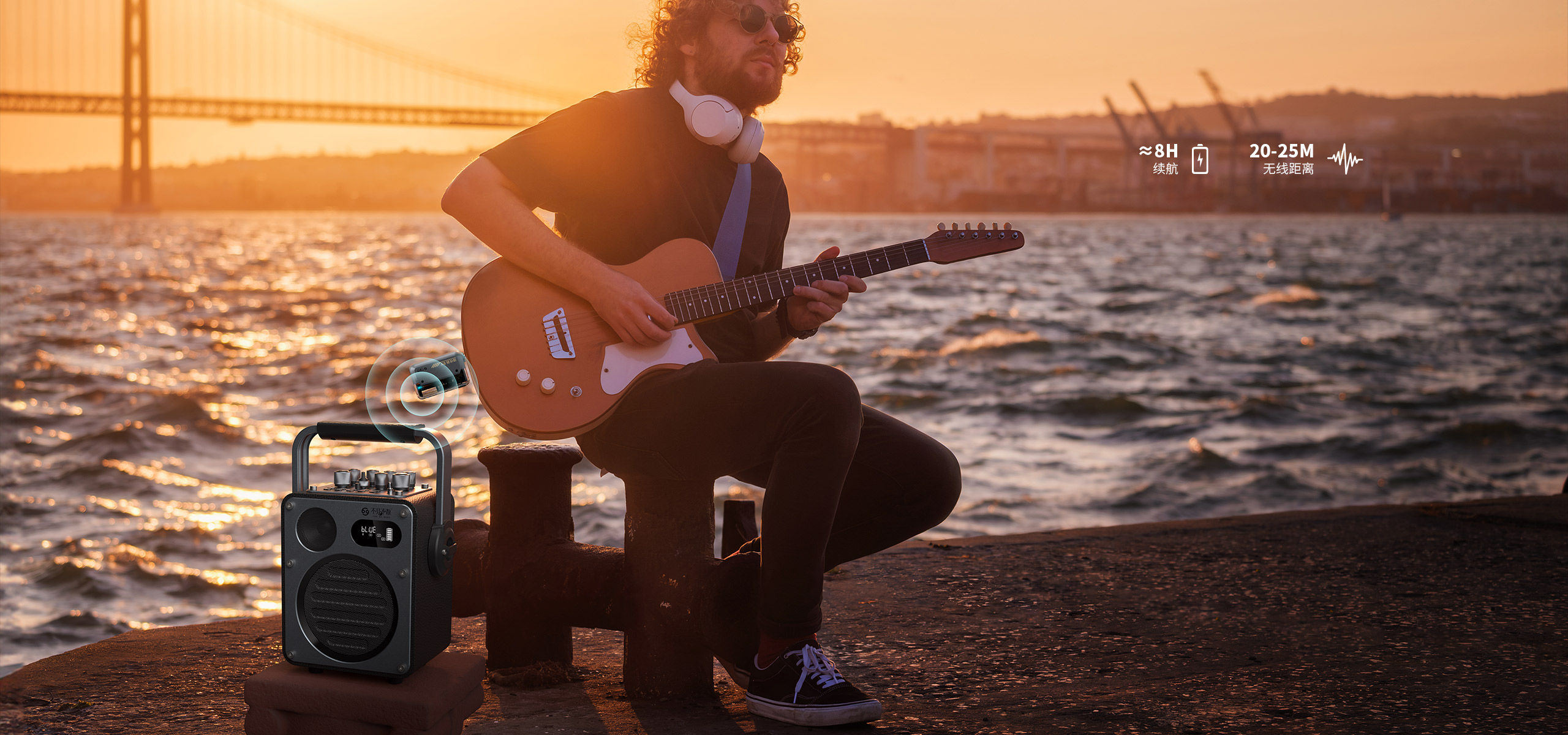 續航約8個小時,發射器與音響無線距離20-25米(視使用環境)。