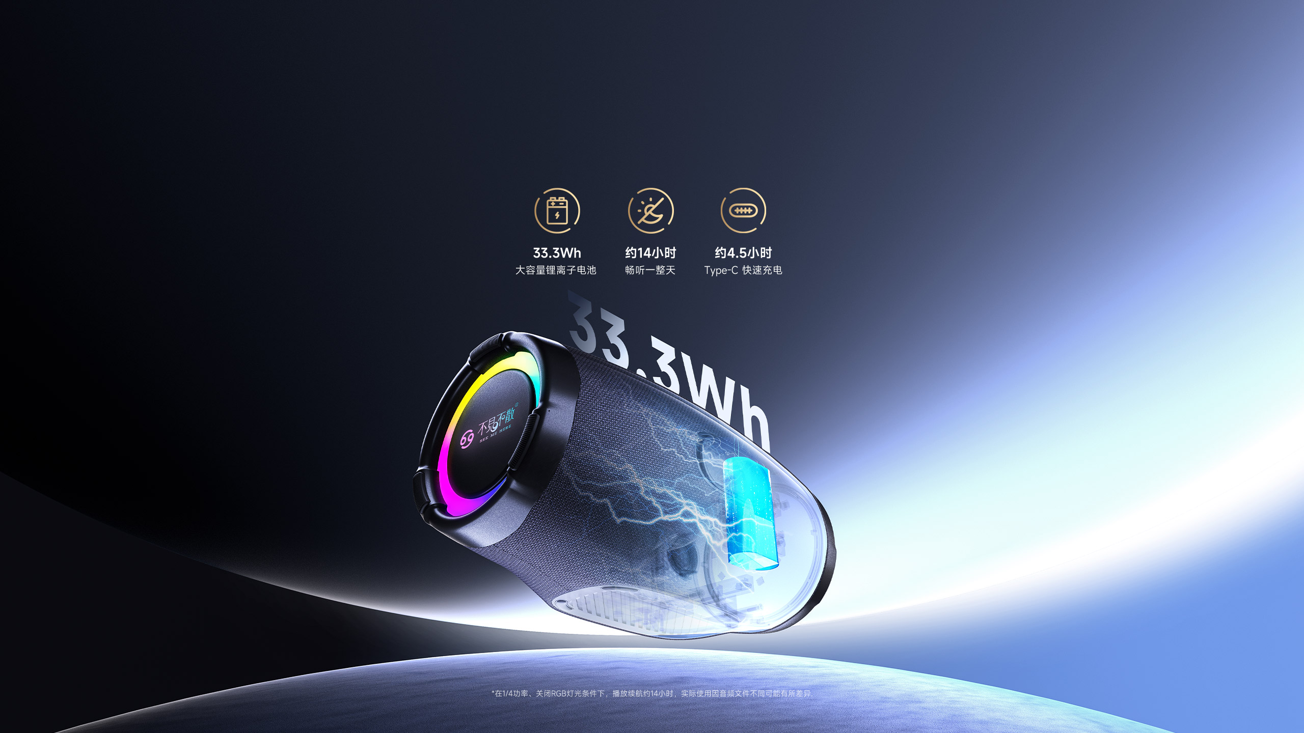 內置33.3Wh 大容量鋰離子電池,支持最長14小時連續播放,陪你嗨足整天。